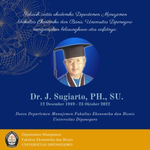 Berita Duka Keluarga besar Departemen Manajemen, Fakultas Ekonomika dan Bisnis, Universitas Diponegoro menyampaikan belasungkawa atas meninggalnya dosen senior – Dr. J. Sugiarto PH., SU. Pada hari Minggu,