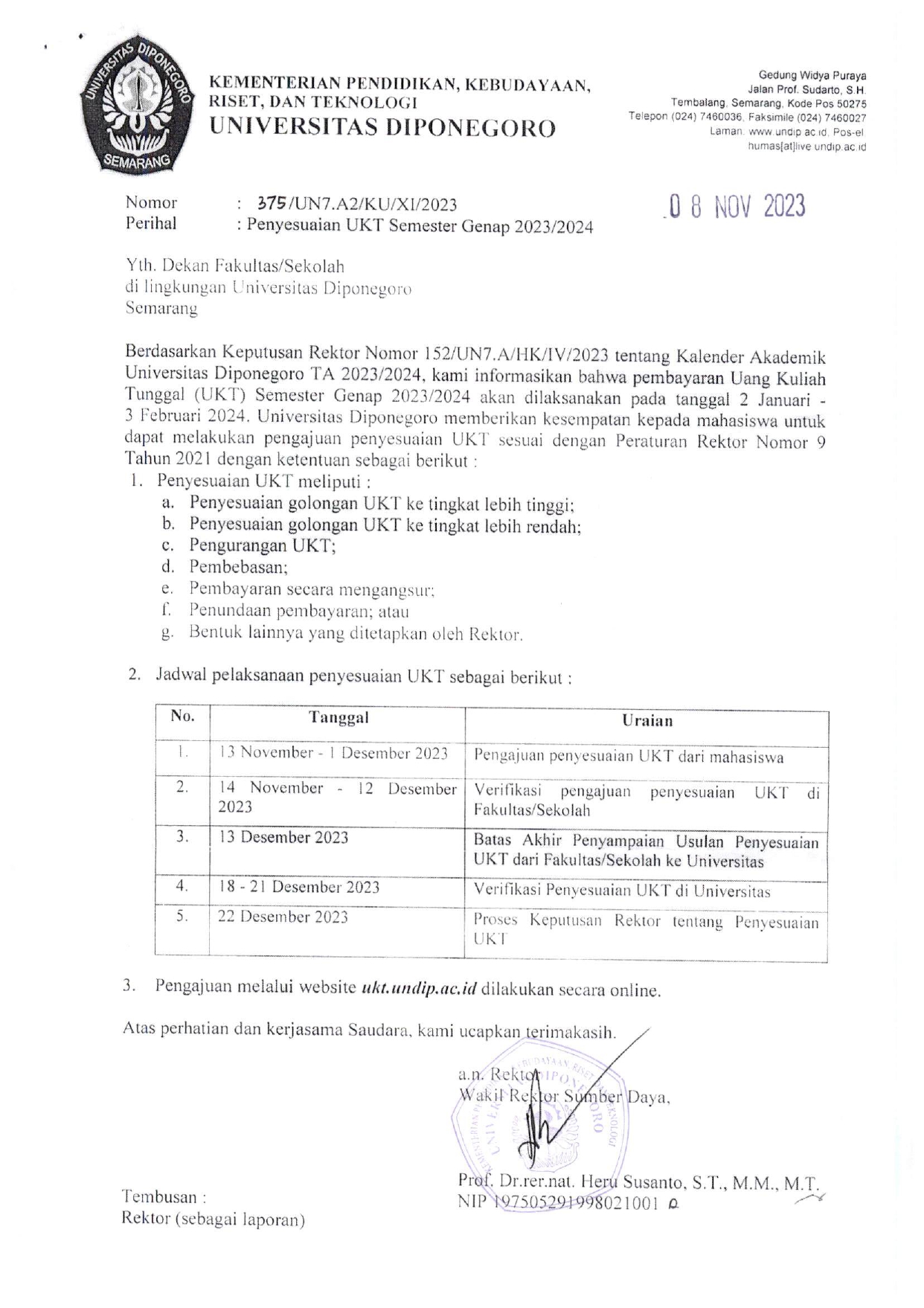 Based on the Rector’s Decision Number 152/UN7.A/HK/IV/2023 regarding the Academic Calendar of Diponegoro University for the Academic Year 2023/2024, we hereby provide information regarding the adjustment of Single Tuition Fees (UKT) for the Odd Semester 2023/2024.