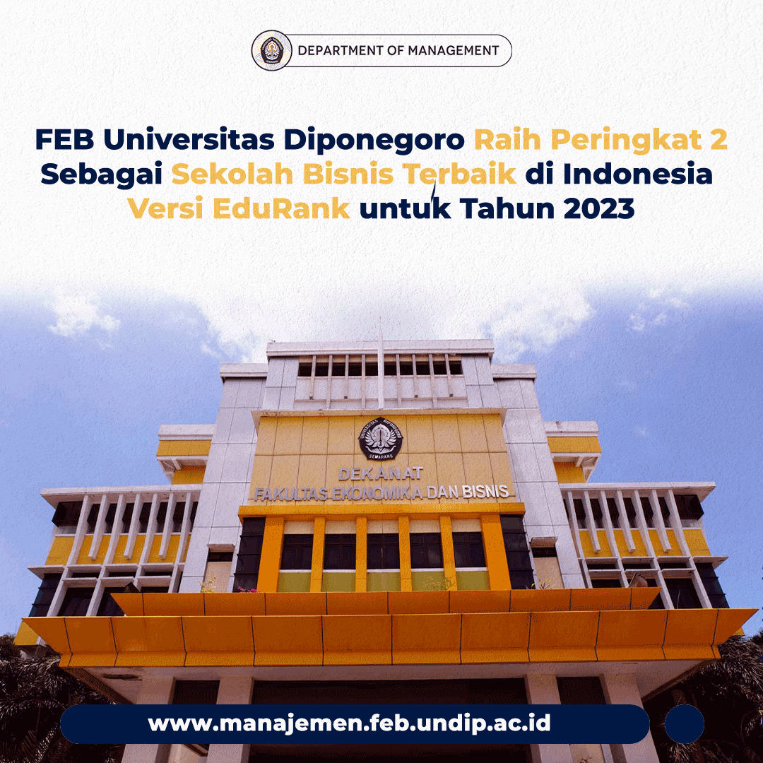 Fakultas Ekonomika dan Bisnis Universitas Diponegoro berhasil meraih peringkat 2 untuk sekolah bisnis di Indonesia dan peringkat 540 dunia dengan 3.550 publikasi yang dibuat dan 3.155 kutipan yang diterima. Topik penelitian utama yang diambil adalah Investasi Perbankan dan Perdagangan Saham, Akuntansi, Pemasaran, Periklanan, dan Manajemen Sumber Daya Manusia. Universitas Diponegoro berhasil meraih peringkat 6 di Indonesia dan 1151 dunia pada tahun 2023, serta mencetak prestasi sebagai salah satu TOP 50% dari 58 topik penelitian. Rangking universitas ini didasarkan pada 3 faktor: output penelitian (EduRank’s index memiliki 27.021 publikasi dan 34.369 kutipan yang diatribusikan pada universitas), reputasi non-akademik, dan dampak dari 10 alumni terkemuka. Prestasi yang diraih Fakultas Ekonomi dan Bisnis dan Universitas Diponegoro merupakan hasil kerja keras dan dedikasi dari seluruh sivitas akademika. Kita dapat bangga dan optimis bahwa kedepannya akan ada lebih banyak prestasi yang diraih dan terus memperbaiki kualitas pendidikan di Indonesia. Selamat kepada Universitas Diponegoro dan Fakultas Ekonomika dan Bisnis atas prestasi yang telah diraih !