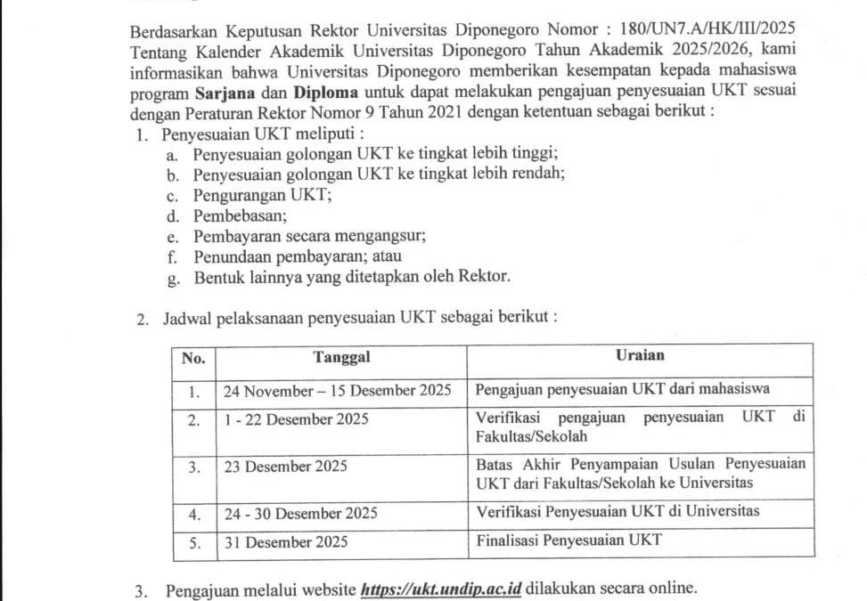 The UKT adjustment process refers to the Rector’s Decree Number: 180/UN7.A/HK/III/2025 regarding the Academic Calendar of Universitas Diponegoro for the 2025/2026 Academic Year, and is carried out in accordance with Rector Regulation Number 9 of 2021.